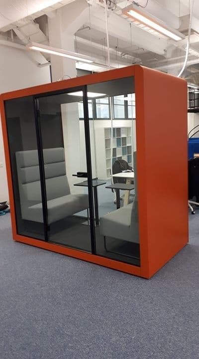 These acoustic office pods have measured up to 40dB lower inside than outside of them and feature both laminated safety glass and an acoustic felt interior for optimal acoustic performance. Our motion-activated lighting and ventilation ensure efficient energy consumption and ventilation, with an air flow of 28 L/S. Our acoustic office booths come outfitted with a power outlet and USB. General power supply can be fed though the top of the ceiling or from under the floor panel. The energy-efficient air circulation system guarantees a fresh atmosphere for longer phone calls, conversations and meetings. Smart Device Solution (Optional) – This enables your smart device or computer to check whether the pod is being used at the moment, book your time slot and regulate light, temperature and ventilation within.
