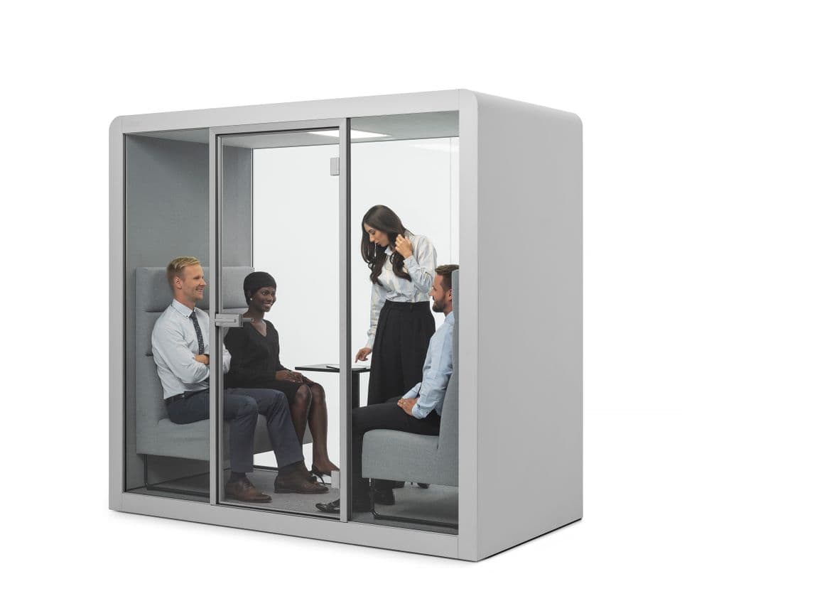 These acoustic office pods have measured up to 40dB lower inside than outside of them and feature both laminated safety glass and an acoustic felt interior for optimal acoustic performance. Our motion-activated lighting and ventilation ensure efficient energy consumption and ventilation, with an air flow of 28 L/S. Our acoustic office booths come outfitted with a power outlet and USB. General power supply can be fed though the top of the ceiling or from under the floor panel. The energy-efficient air circulation system guarantees a fresh atmosphere for longer phone calls, conversations and meetings. Smart Device Solution (Optional) – This enables your smart device or computer to check whether the pod is being used at the moment, book your time slot and regulate light, temperature and ventilation within.