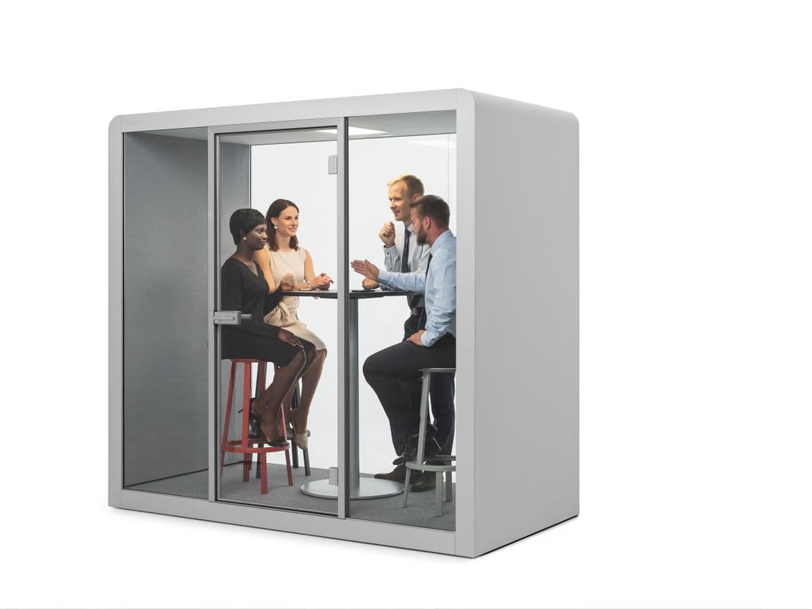 These acoustic office pods have measured up to 40dB lower inside than outside of them and feature both laminated safety glass and an acoustic felt interior for optimal acoustic performance. Our motion-activated lighting and ventilation ensure efficient energy consumption and ventilation, with an air flow of 28 L/S. Our acoustic office booths come outfitted with a power outlet and USB. General power supply can be fed though the top of the ceiling or from under the floor panel. The energy-efficient air circulation system guarantees a fresh atmosphere for longer phone calls, conversations and meetings. Smart Device Solution (Optional) – This enables your smart device or computer to check whether the pod is being used at the moment, book your time slot and regulate light, temperature and ventilation within.