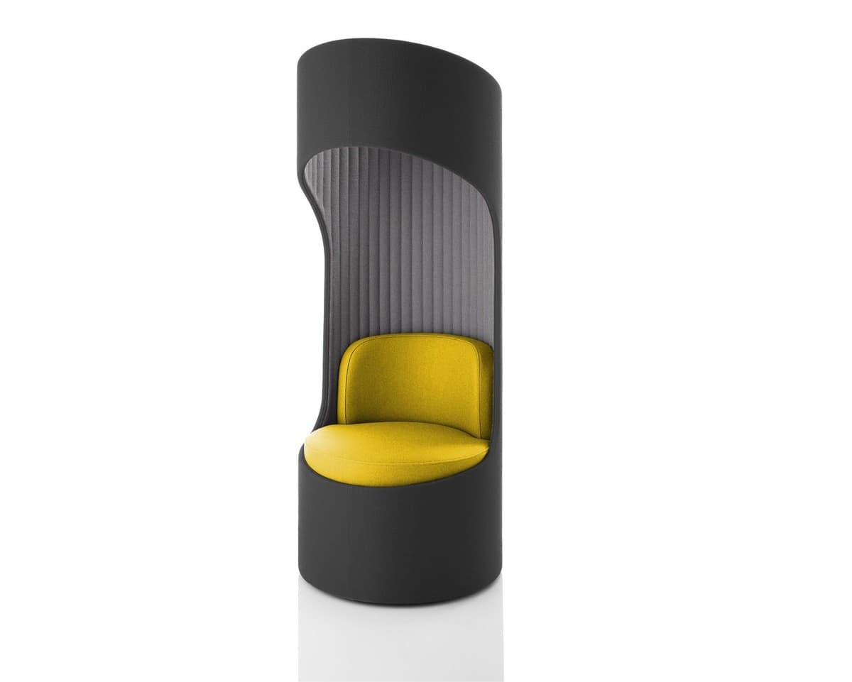 This contoured personal touchdown space design has been intentionally developed to reduce peripheral vision and external noise, while the open top structure allows for the correct level of ambient light to pass through the system. It provides the perfect place to take a call or to work independently in conjunction with a laptop table. Its swivel mechanism allows the user to turn away from background noise for enhanced levels of privacy.