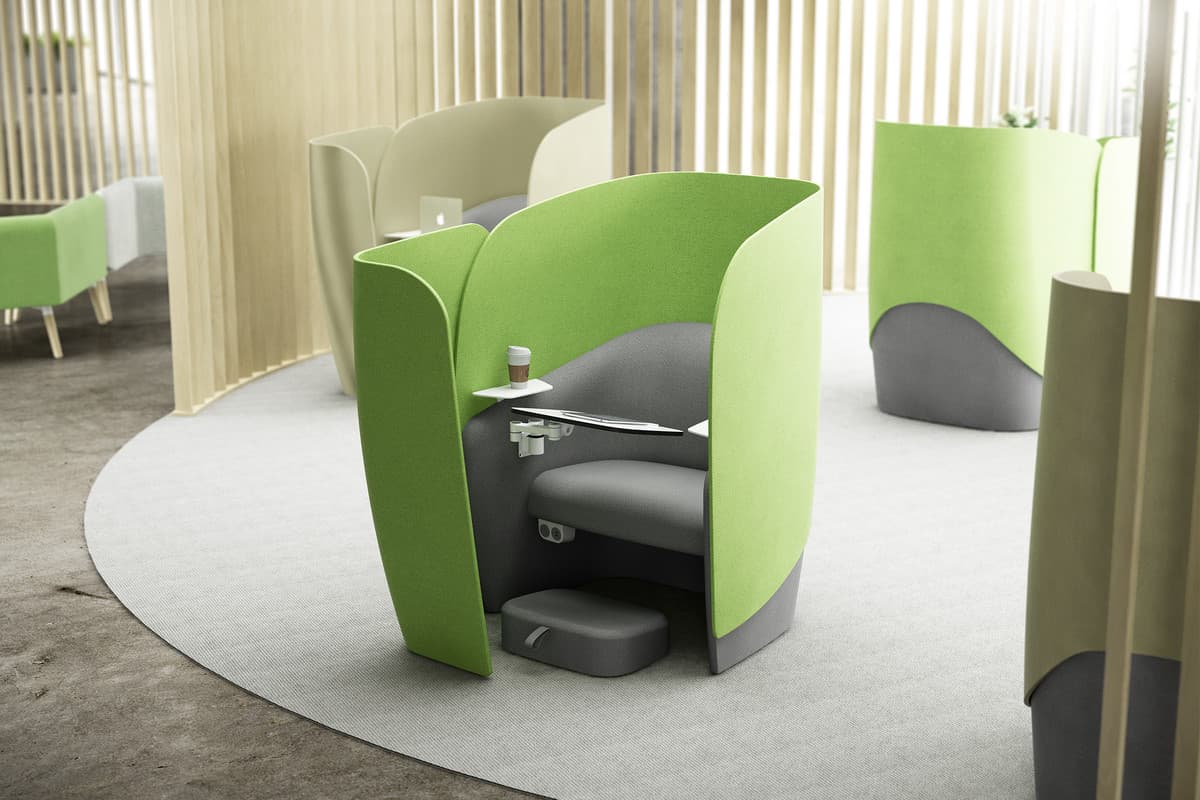 This acoustic social distancing furniture solution is a personal workspace with an acoustic privacy screen and multi-positional writing tablet for quiet and private working. Arm shelves and power options provide additional work surfaces and connectivity. Dual density foams support the user and there is storage underneath the seat area. An upholstered return screen can be added to the front of the unit to further enhance user privacy.