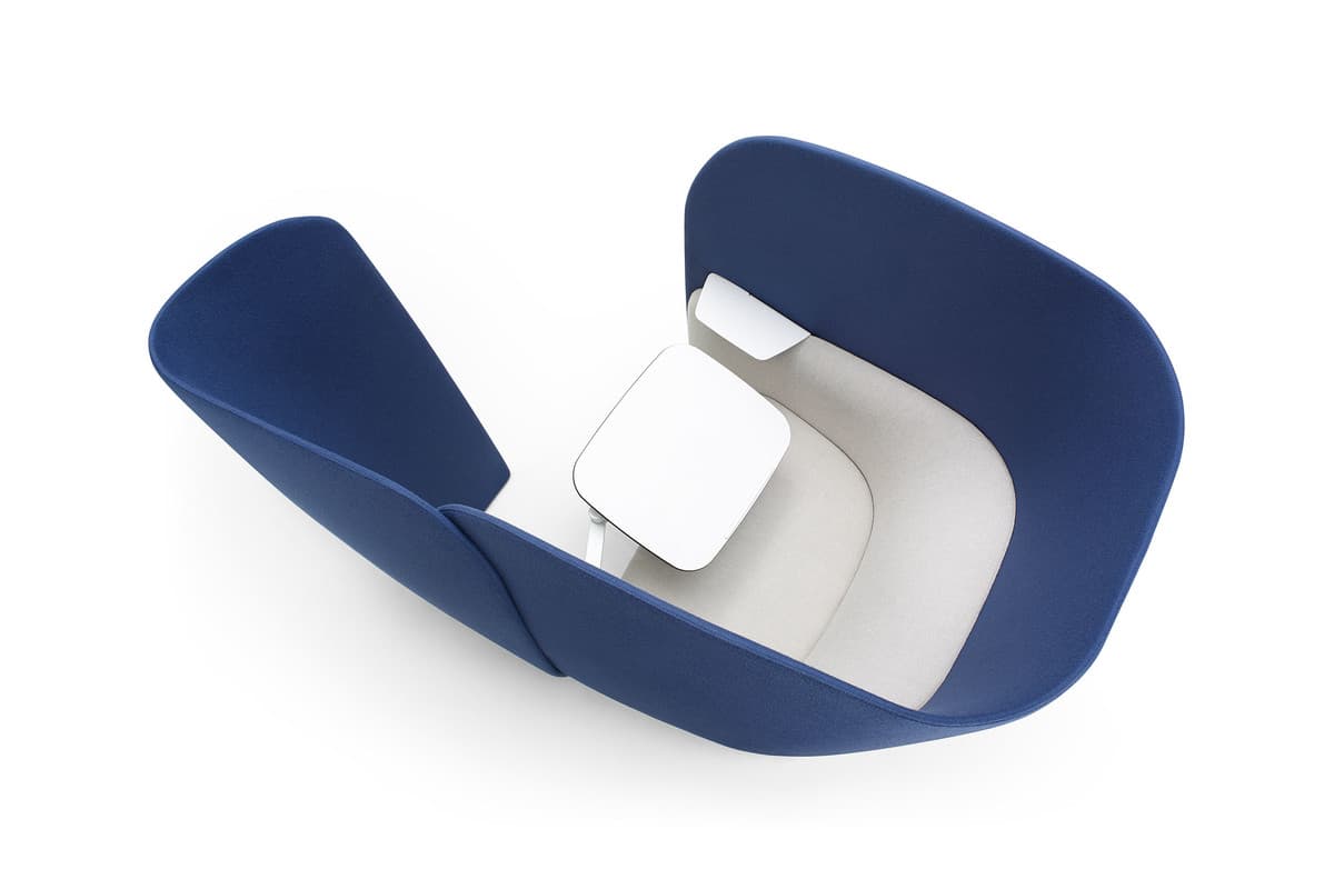 This acoustic social distancing furniture solution is a personal workspace with an acoustic privacy screen and multi-positional writing tablet for quiet and private working. Arm shelves and power options provide additional work surfaces and connectivity. Dual density foams support the user and there is storage underneath the seat area. An upholstered return screen can be added to the front of the unit to further enhance user privacy.