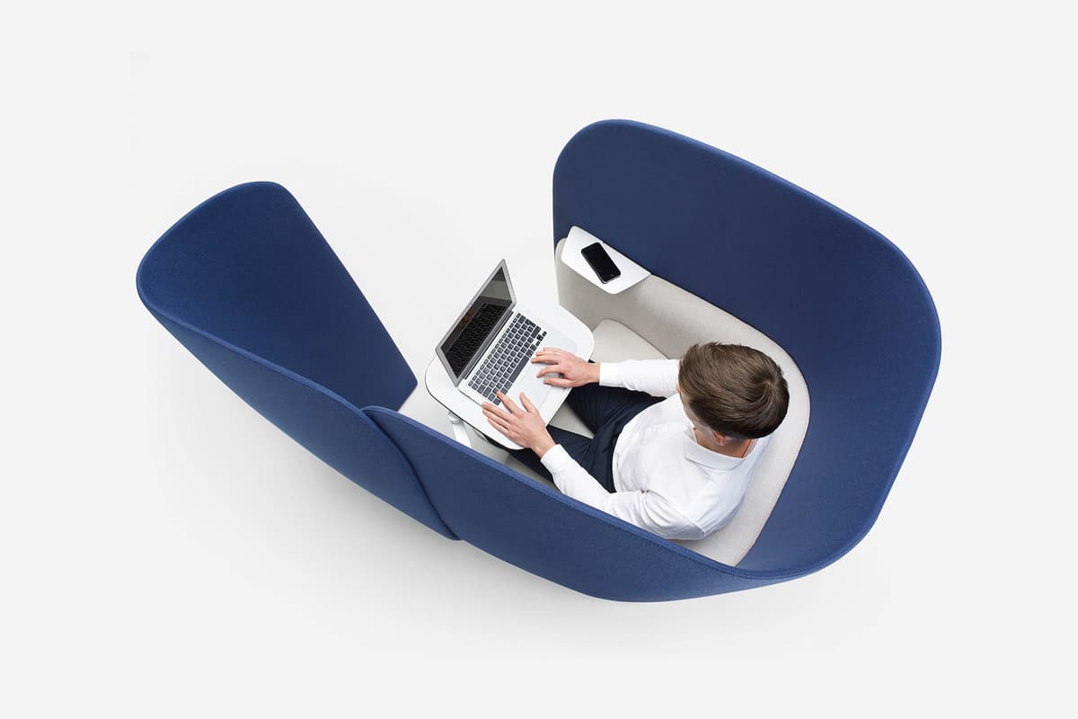 This acoustic social distancing furniture solution is a personal workspace with an acoustic privacy screen and multi-positional writing tablet for quiet and private working. Arm shelves and power options provide additional work surfaces and connectivity. Dual density foams support the user and there is storage underneath the seat area. An upholstered return screen can be added to the front of the unit to further enhance user privacy.