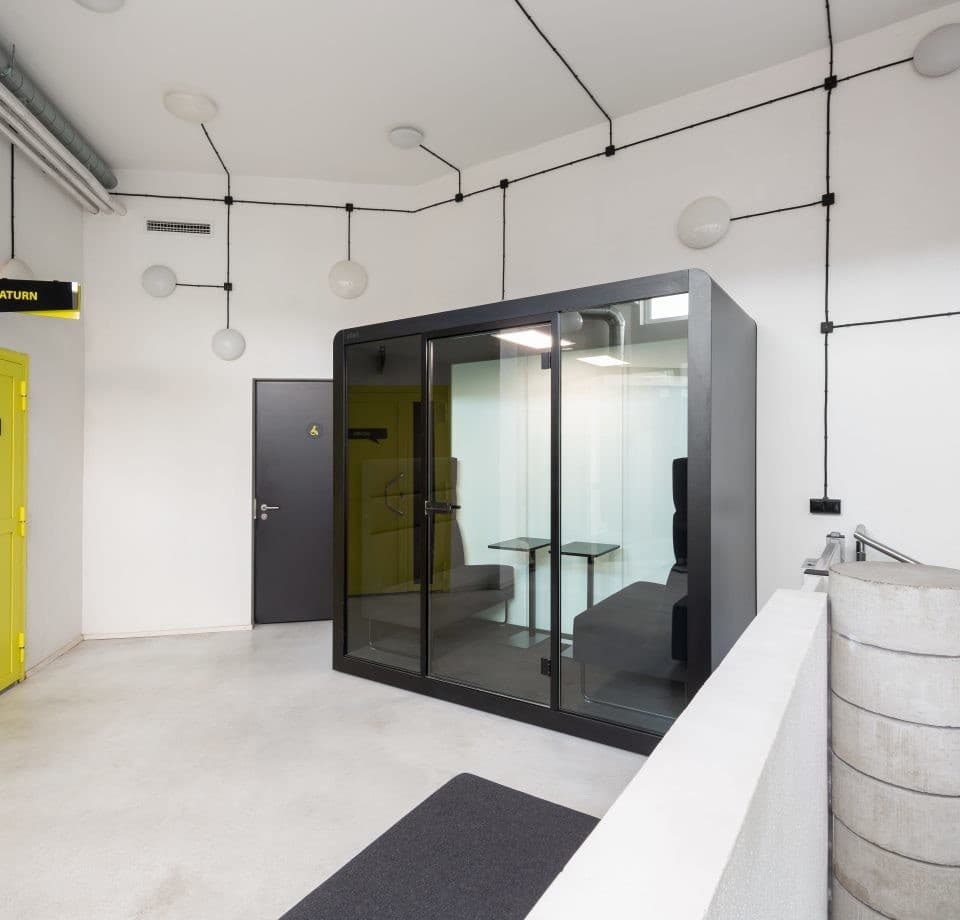 These acoustic office pods have measured up to 40dB lower inside than outside of them and feature both laminated safety glass and an acoustic felt interior for optimal acoustic performance. Our motion-activated lighting and ventilation ensure efficient energy consumption and ventilation, with an air flow of 28 L/S. Our acoustic office booths come outfitted with a power outlet and USB. General power supply can be fed though the top of the ceiling or from under the floor panel. The energy-efficient air circulation system guarantees a fresh atmosphere for longer phone calls, conversations and meetings. Smart Device Solution (Optional) – This enables your smart device or computer to check whether the pod is being used at the moment, book your time slot and regulate light, temperature and ventilation within.