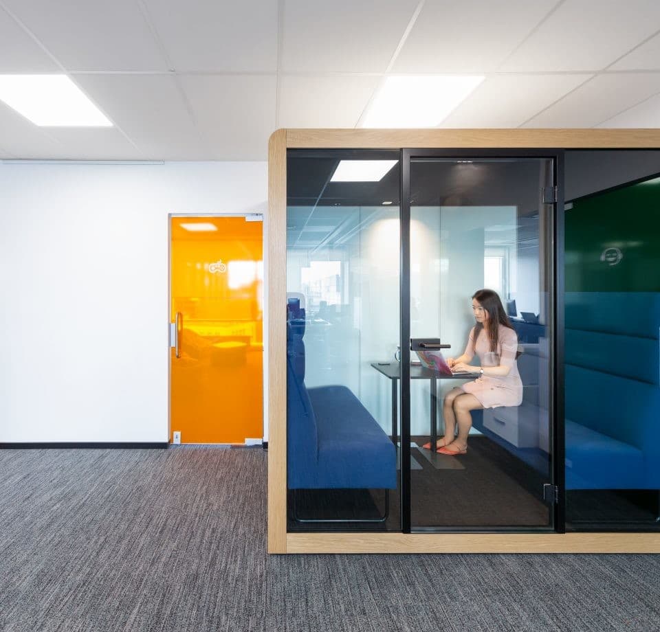 These acoustic office pods have measured up to 40dB lower inside than outside of them and feature both laminated safety glass and an acoustic felt interior for optimal acoustic performance. Our motion-activated lighting and ventilation ensure efficient energy consumption and ventilation, with an air flow of 28 L/S. Our acoustic office booths come outfitted with a power outlet and USB. General power supply can be fed though the top of the ceiling or from under the floor panel. The energy-efficient air circulation system guarantees a fresh atmosphere for longer phone calls, conversations and meetings.Smart Device Solution (Optional) – This enables your smart device or computer to check whether the pod is being used at the moment, book your time slot and regulate light, temperature and ventilation within.