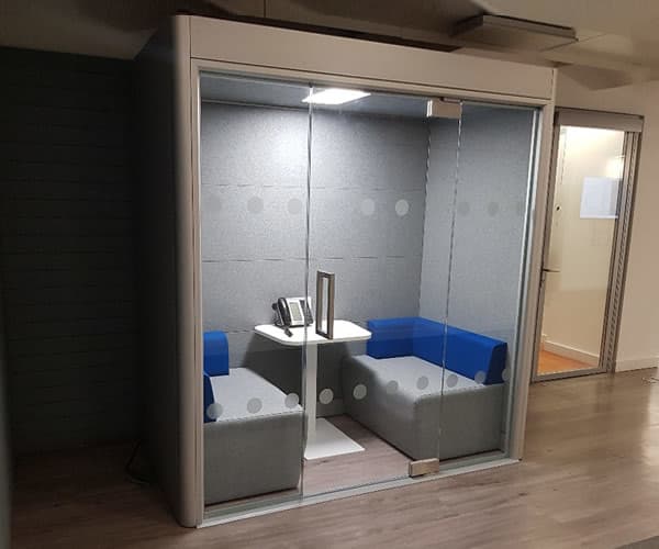 Privacy Pod for up to 4 people with Door - Provides a peaceful environment for phone calls, video conferences, interviews, private meetings, as well as dedicated team working space where up to four people can focus on a task, removing themselves from office distractions. Includes enclosed ceiling with LED light, passive infra-red sensor, air circulation fan, acoustic lined interior panels, (2) low-back sofas, small pedestal table 20”W x 34”D x 29”H, 2 power + 2 USB charging cove, leveling glides, cut-out for electric. External Dimensions: 84"W x 59"D x 89"H.