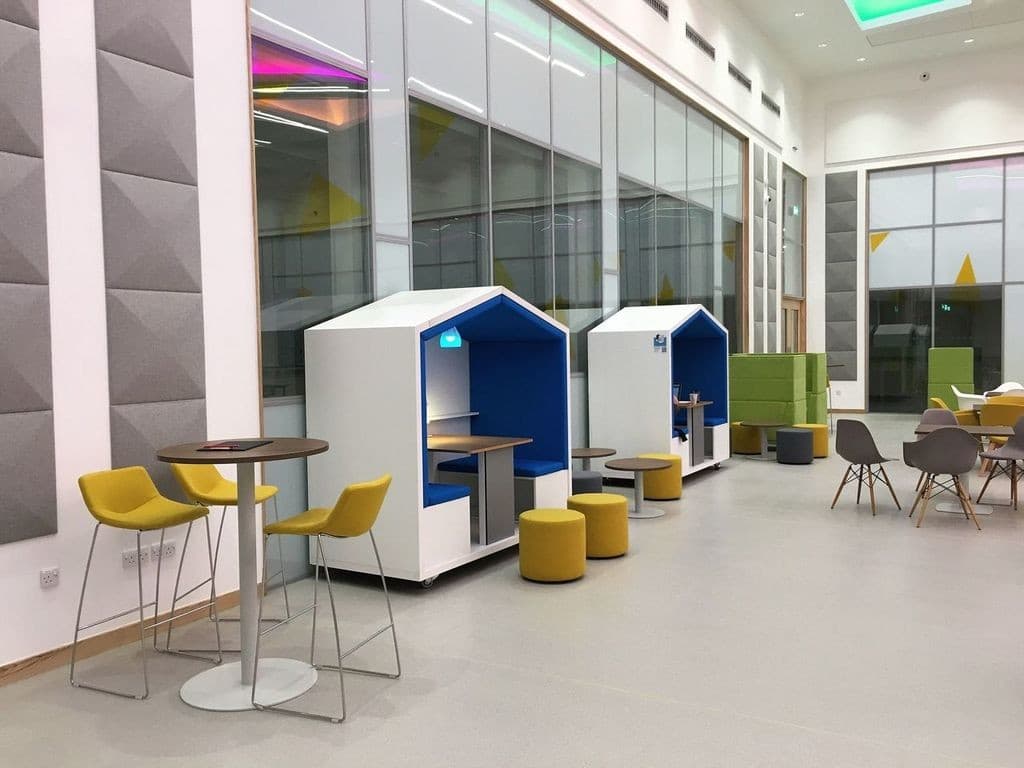Mobile Privacy Pod for 1-2 people that is Open on one side - This design is less "claustrophobic" than the enclosed pods with doors and balances the openness and approachability with a surprising quietness once inside. Includes table, seating, 3 power + 3 USB charging outlets, and ceiling lamp. Mobility - Comes with heavy-duty locking casters so that 1-2 people can easily move the unit. This portability enables hyper-agile environments. External Dimensions: 79"W x 36'D x 77"H. 570lbs