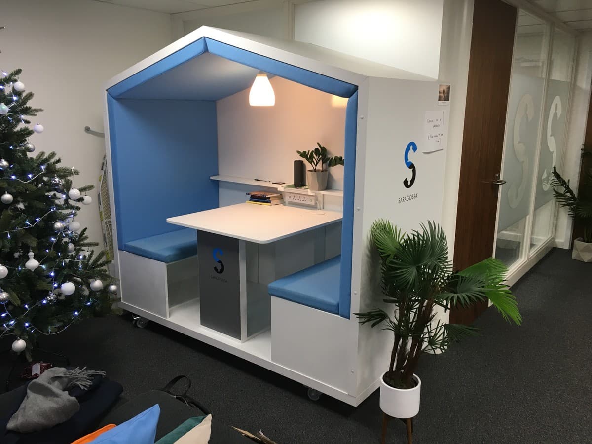 Mobile Privacy Pod for 1-2 people that is Open on one side - This design is less "claustrophobic" than the enclosed pods with doors and balances the openness and approachability with a surprising quietness once inside. Includes table, seating, 3 power + 3 USB charging outlets, and ceiling lamp. Mobility - Comes with heavy-duty locking casters so that 1-2 people can easily move the unit. This portability enables hyper-agile environments. External Dimensions: 79"W x 36'D x 77"H. 570lbs