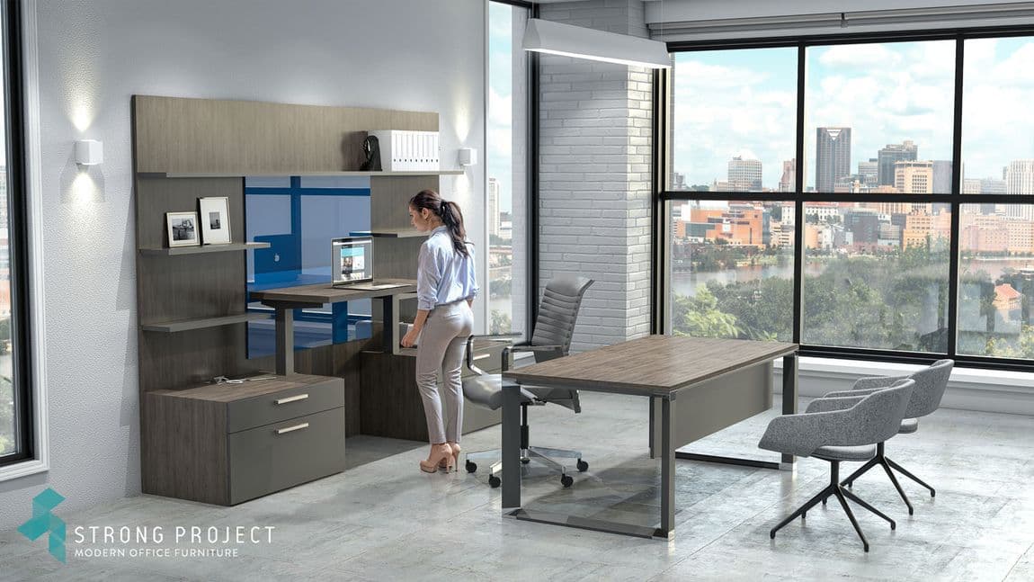 • Thoughtfully nested mechanisms for height adjustable worksurfaces ensure attractive wellness options while maintaining the main executive desk for meetings.