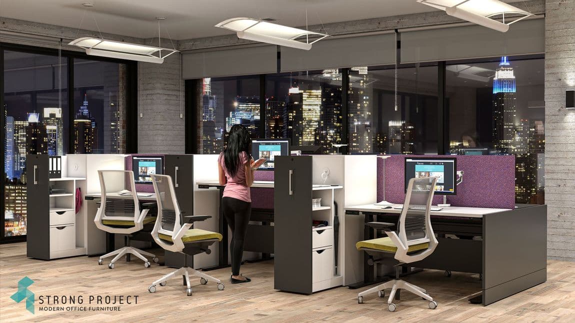 This modern height adjustable workstation system is customizable with laminate side panels with acrylic up-mounts as well as frontal acoustic felt dividers and acrylic up-mounts. All heights of the laminate dividers and acrylic up-mount screens are customizable. The most common divider heights to achieve a feeling of openness while giving users a sense of space and privacy are 49'H overall (laminate side panel + acrylic up-mount) coupled with 12' frontal acoustic dividers with an 8' acrylic up-mount. The most common desktop sizes are 30'D x 60'W, 30'D x 72'W and 30'D x 84'W, but these are customizable as well. The typical storage components coupled with this system are either a Mobile Filing Pedestal or a Low Storage Credenza containing oversized storage and filing drawers coupled with pop-up tech modules for USB and Electrical access to quick charge phones and tablets. Seat cushions can be applied to the low credenzas for impromptu quick meetings with an associate. This contemporary workstation system features a technology spine that accommodates ample data drops and includes an integrated 4-circuit/8-wire electrical system. From a design perspective, there are numerous laminate and thermofoil worksurface and side panel finish options in modern woodgrains as well as white and other solids. The frontal acoustic felt dividers come in 15 different colors to work with your building interior and brand as well as COMs. The frontal up-mounts and side dividers have numerous acrylic color options as well as customization capability with resins such as 3form, Lumicor, etc. This stylish modular office furniture system will give you the flexibility to create a work environment that provides users with their own sense of space, fosters creativity and well-being and can be customized from a design perspective to meld with your building interior and brand.