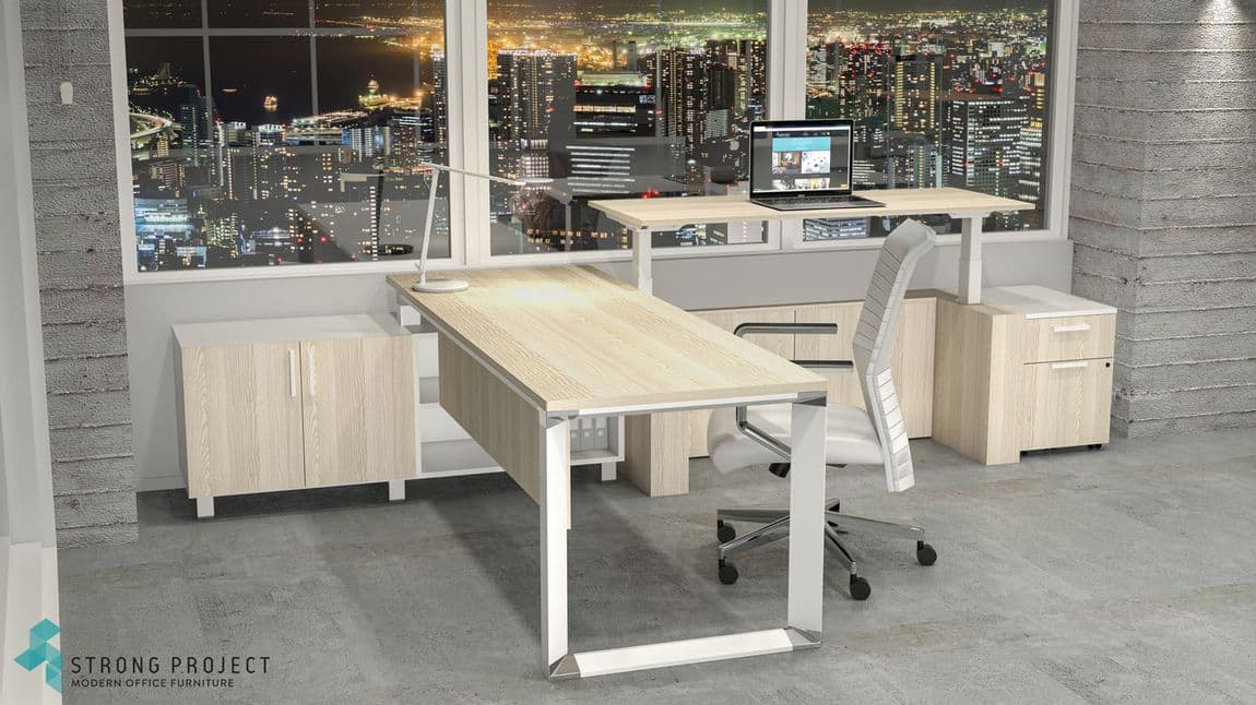 This enhanced but affordable Height Adjustable Executive Office Desk design incorporates the Sit-Stand Platform on the return side instead of the main desk and hides wires behind access doors in the base of the return.