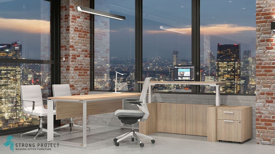 Thoughtfully nested mechanisms for height adjustable worksurfaces ensure attractive wellness options while maintaining the main executive desk for meetings.
