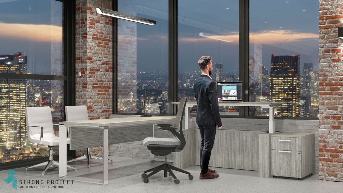 - Thoughtfully nested mechanisms for height adjustable worksurfaces ensure attractive wellness options while maintaining the main executive desk for meetings.