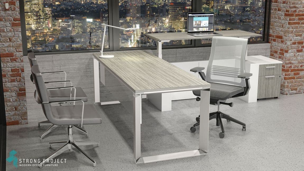 Thoughtfully nested mechanisms for height adjustable worksurfaces ensure attractive wellness options while maintaining the main executive desk for meetings.