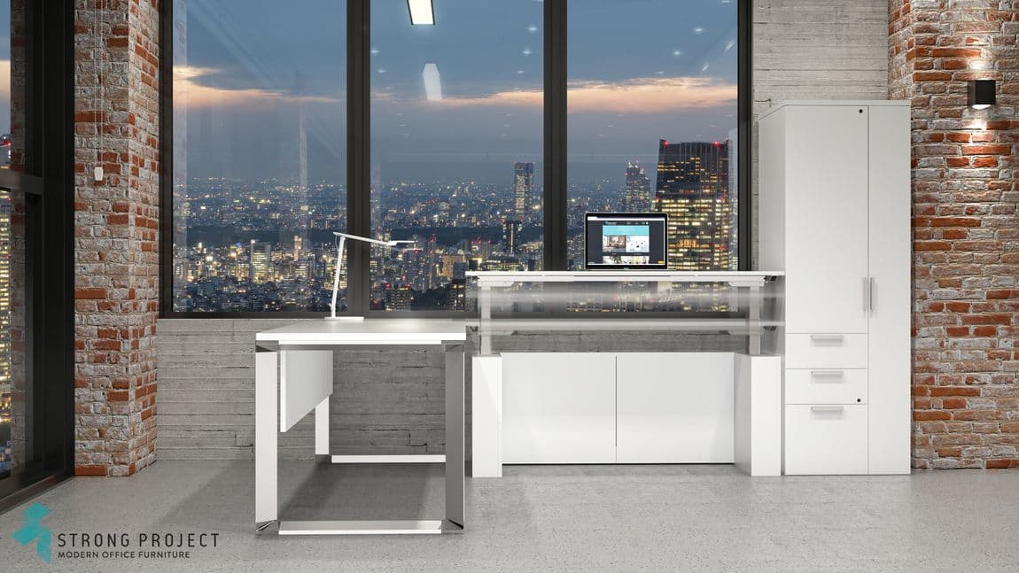This enhanced but affordable Height Adjustable Executive Office Desk design incorporates the Sit-Stand Platform on the return side instead of the main desk and hides wires behind access doors in the base of the return.