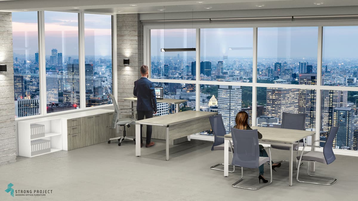 This enhanced but affordable Adjustable-Height Executive Office Desk set and Meeting Table design incorporates the electronic height adjustable platform on the return side instead of the main desk and hides wires behind access doors in the base of the return.