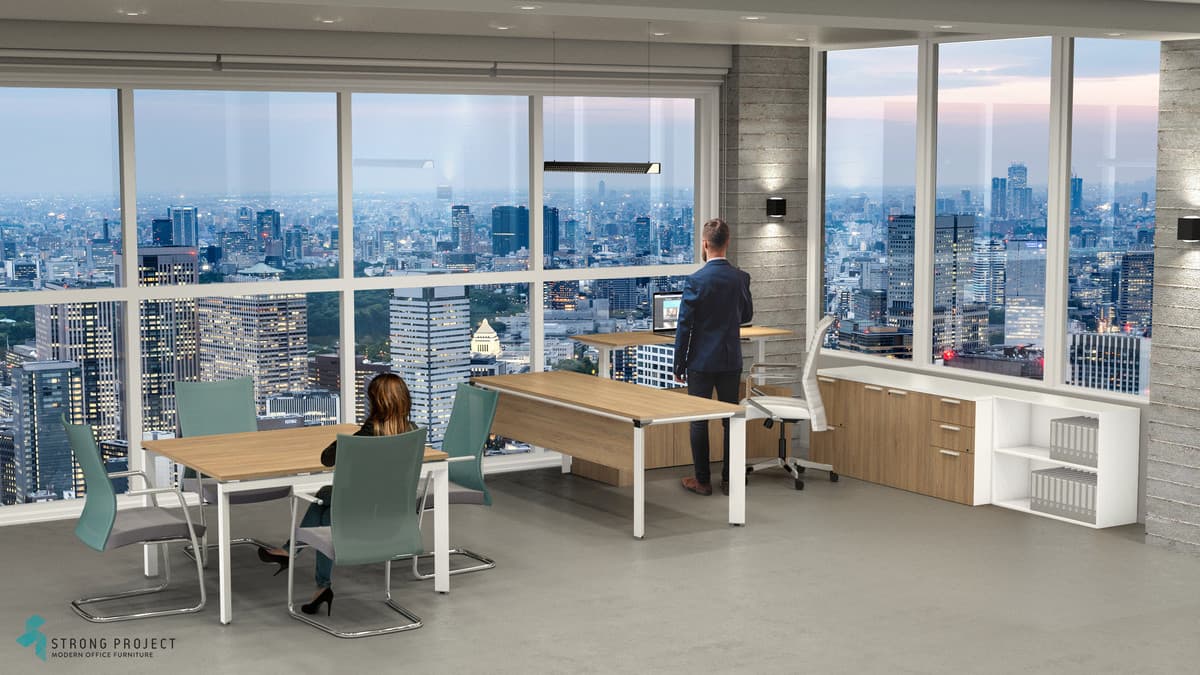 This enhanced but affordable Adjustable-Height Executive Office Desk set and Meeting Table design incorporates the electronic height adjustable platform on the return side instead of the main desk and hides wires behind access doors in the base of the return.