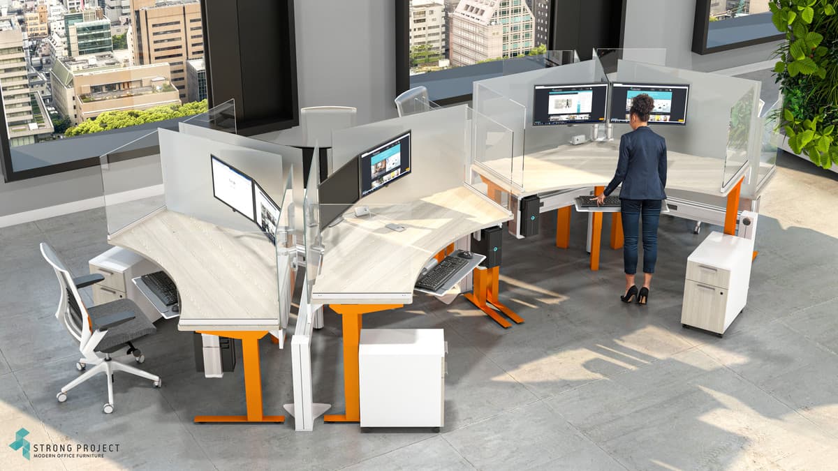 • 24”H Desktop-mounted acrylic screens travel with the height-adjustable desktop providing constant shielding if someone were to cough or sneeze at their desk.