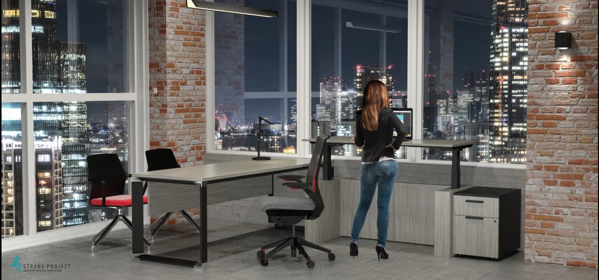 Thoughtfully nested mechanisms for height adjustable worksurfaces ensure attractive wellness options while maintaining the main executive desk for meetings.