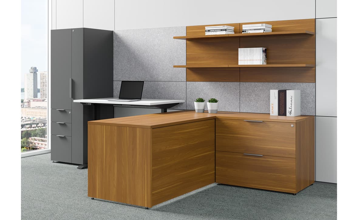 This Height Adjustable Desk and Storage series of Private Office Furniture delivers a super-smart look at an affordable price. Always conceived and created in North America, this transitional style collection includes our coveted laminate-surface collection, proprietary designs in crafted aluminum accents and unique integration of textile components.