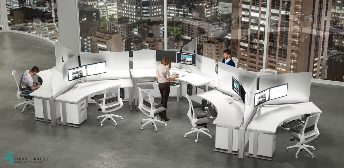• 24”H Desktop-mounted acrylic screens travel with the height-adjustable desktop providing constant shielding if someone were to cough or sneeze at their desk.