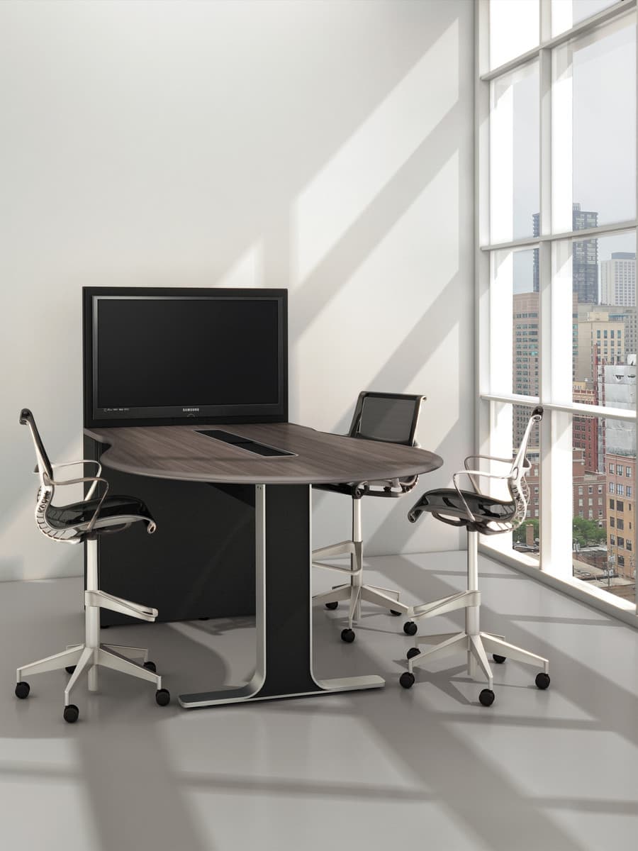 For smaller meetups, this Media Table design is ready for collaboration at any moment. This model includes a storage cabinet and an upper media panel that comes equipped with a mounting bracket. Power and technology can be seamlessly accessed and hidden inside the sleek optional power/data trough with integrated wire management. Available in three heights and several sizes and shapes.