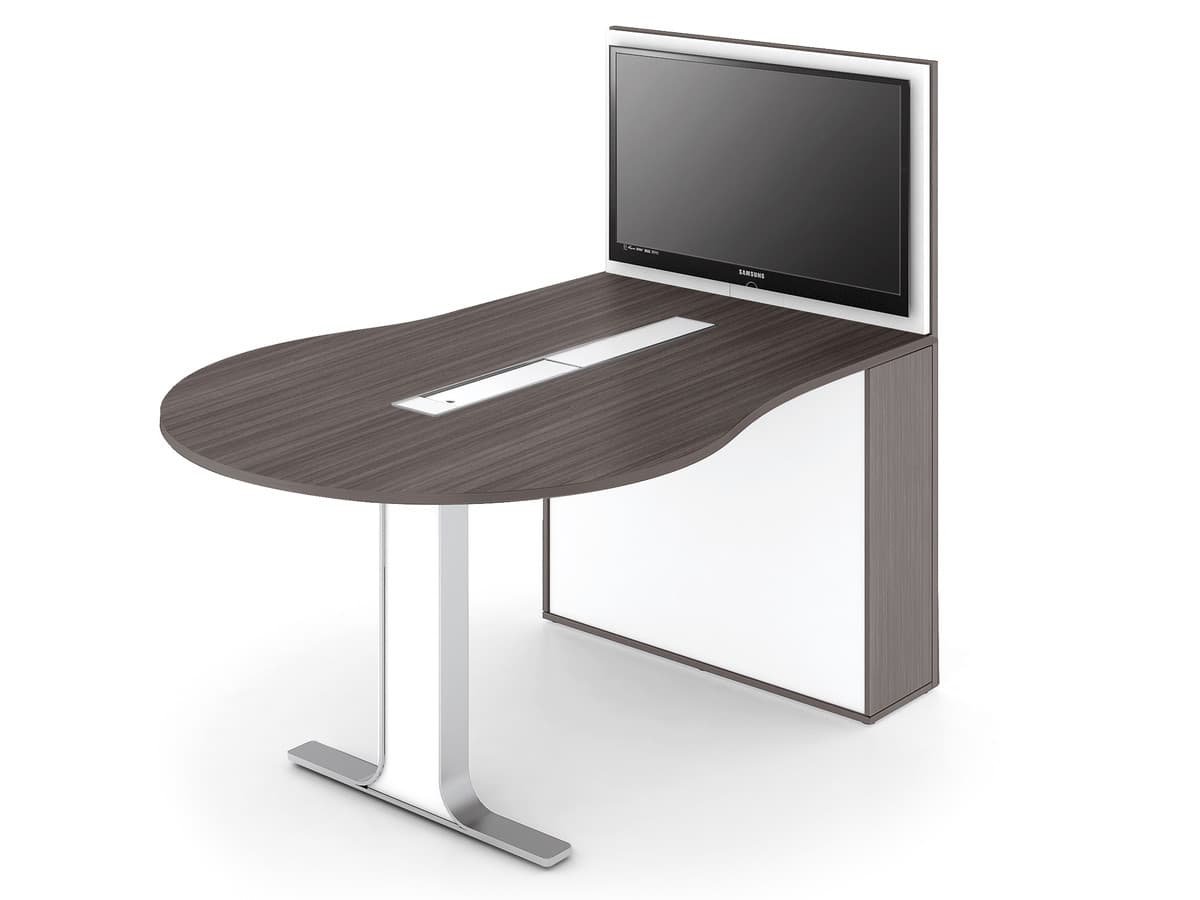 The optional Power/Data Trough provides an elegant, yet effective solution to your tables power and data needs, along with providing storage for such items and remote controls and cables. Also available with a video switch kit for users to share their devices on the attached monitor. Full wire management access via the front leg and back panel is integrated.