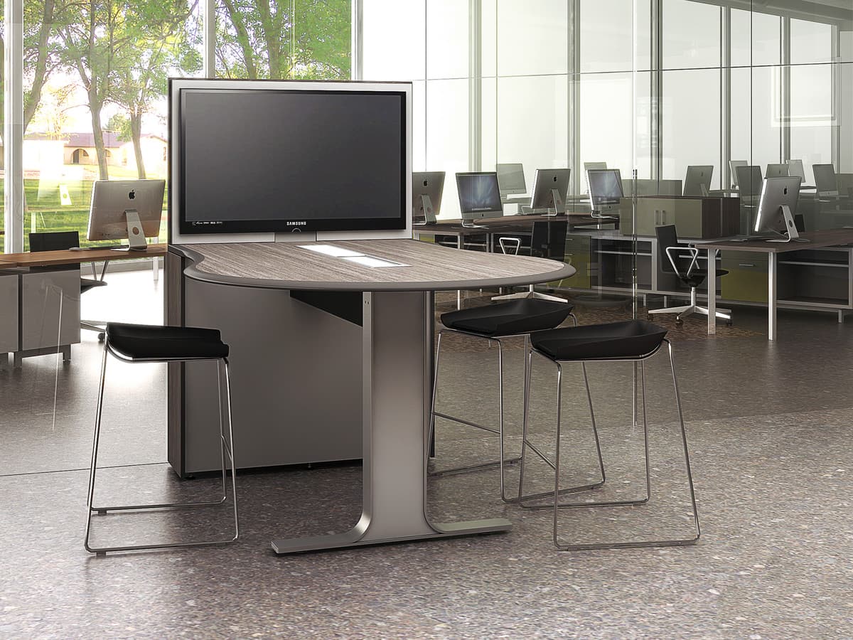 For smaller meetups, this Media Table design is ready for collaboration at any moment. This model includes a storage cabinet and an upper media panel that comes equipped with a mounting bracket. Power and technology can be seamlessly accessed and hidden inside the sleek optional power/data trough with integrated wire management. Available in three heights and several sizes and shapes.
