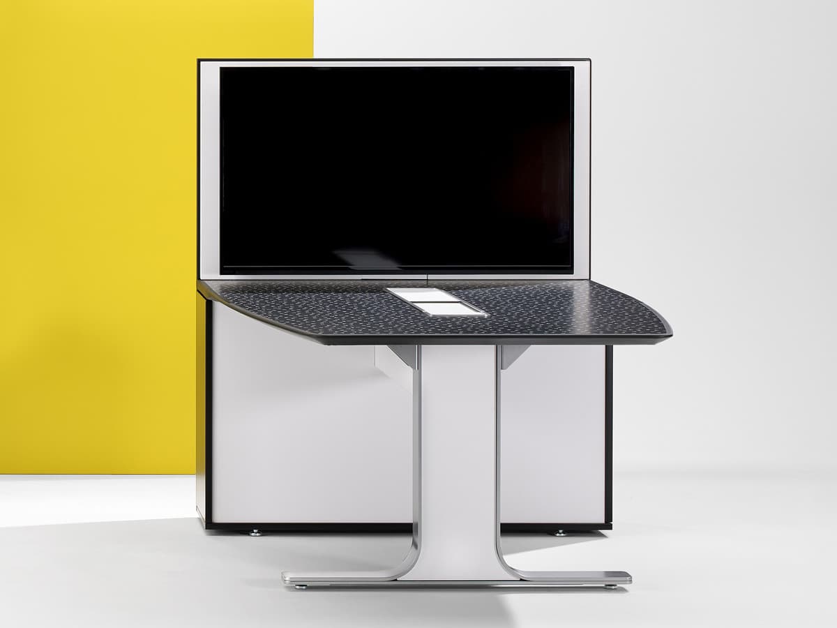 The optional Power/Data Trough provides an elegant, yet effective solution to your tables power and data needs, along with providing storage for such items and remote controls and cables. Also available with a video switch kit for users to share their devices on the attached monitor. Full wire management access via the front leg and back panel is integrated.