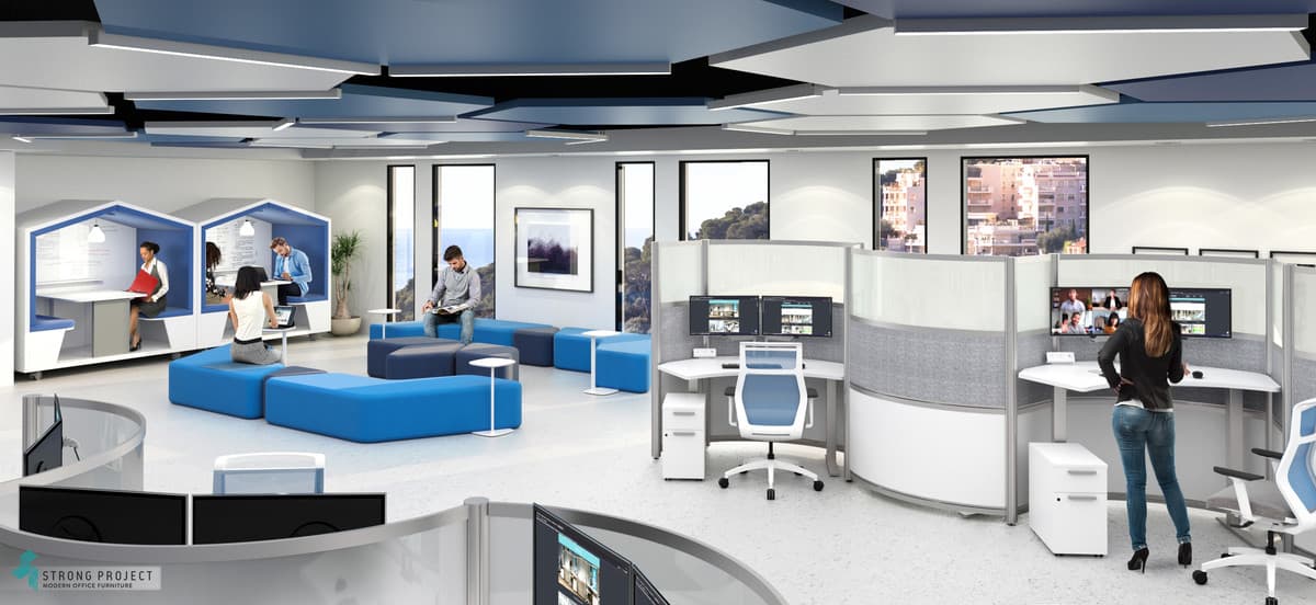 Thinking about changing the layout of your office? You may want to start by spending a moment on this question. There are many ways in which teams gather; team meetings, smaller group brainstorming sessions, and one-on-one huddles. Each type of space needed should include collaborative office furniture that will match the purpose of the gathering. Consider form and function when designing your layout. Create spaces that employees will seek out to work in and increase the chance of not only planned but spontaneous collaboration. All the furniture in this scene is available for purchase. Featured here are our innovative Sit-Stand Curved Cubicles paired with some of our Collaborative Lounge Furniture and Acoustic Meeting Pod designs. Let us help you Create an atmosphere that drives productivity, fuels innovation, inspires creativity, and encourages community.