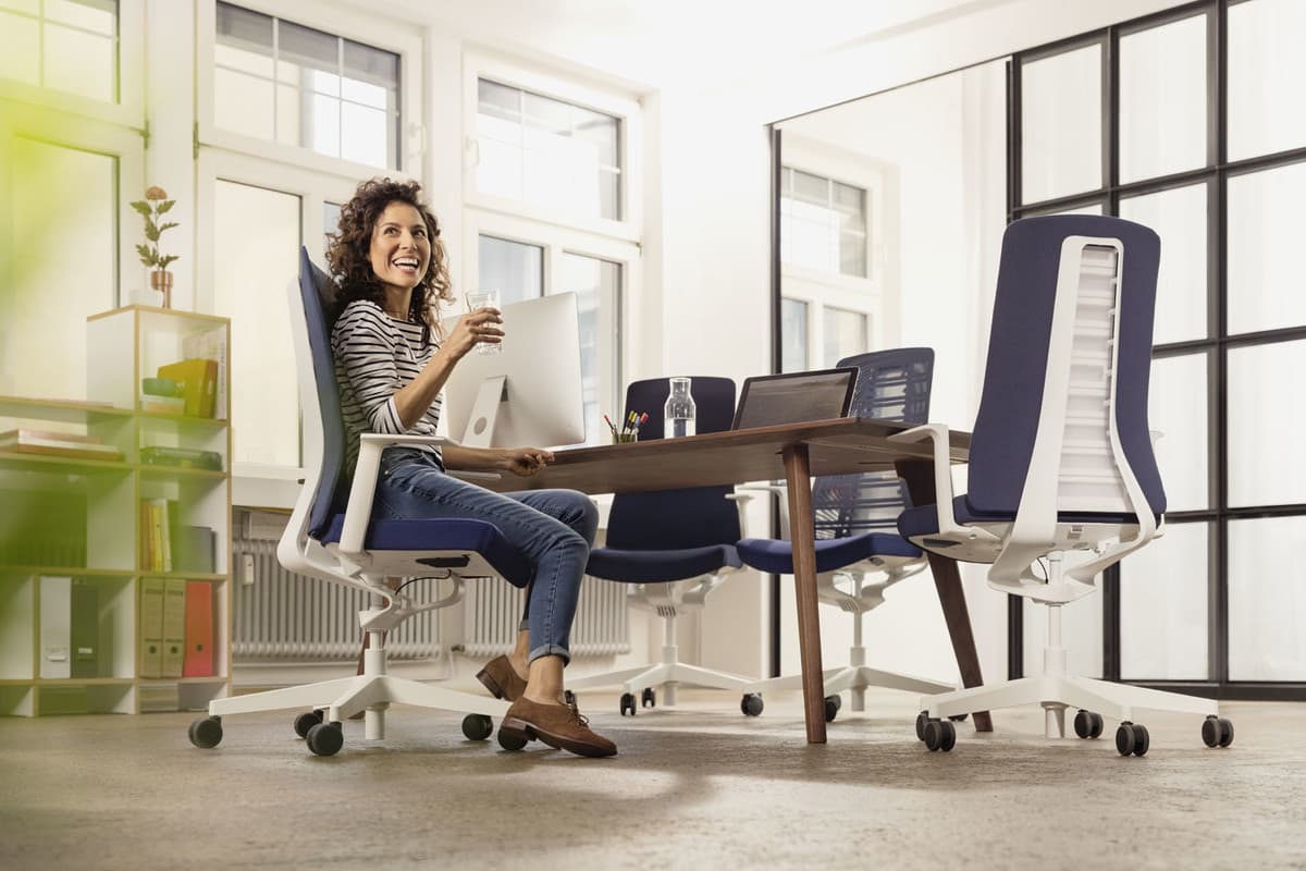 This ergonomic conference chair design is designed for sitting and made for movement. Unlike any other office conference chair, it has been developed entirely with active people in mind. This approach has required a complete re-invention of the "office chair". It adjusts to the user, their body and movements without requiring them to make time-consuming adjustments. Complicated and heavy mechanisms are no longer required. It not only allows a wide range of movement but also ensures that the user stays comfortable, active and sufficiently supported at all times.