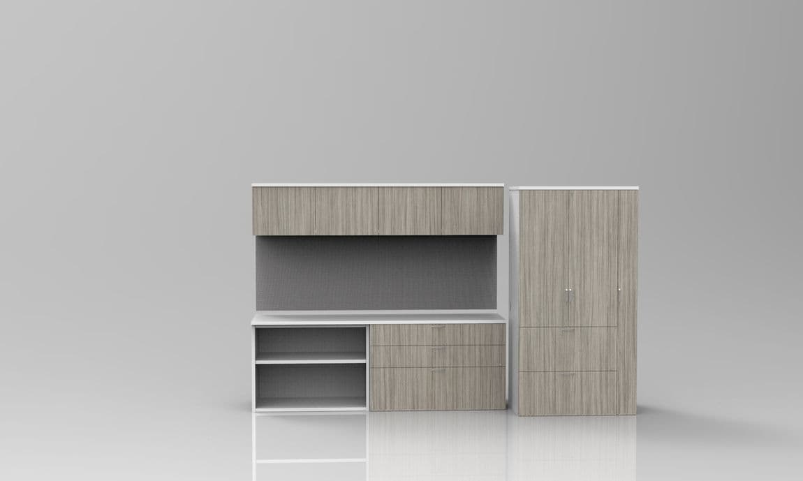 Our Customized Storage Walls can be designed to your exact functional requirements and come in numerous finishes to accompany any Desk or Interior including NEW Textured and Rustic Woodgrain Laminates, as well as Solid Colors. Storage Walls can be configured with Wardrobe Towers, File Cabinets, Storage Cabinets, Open Bookcases, Wall-Mounted Overhead Bins and Tack Panels…You choose the storage combination that works best for your needs!
