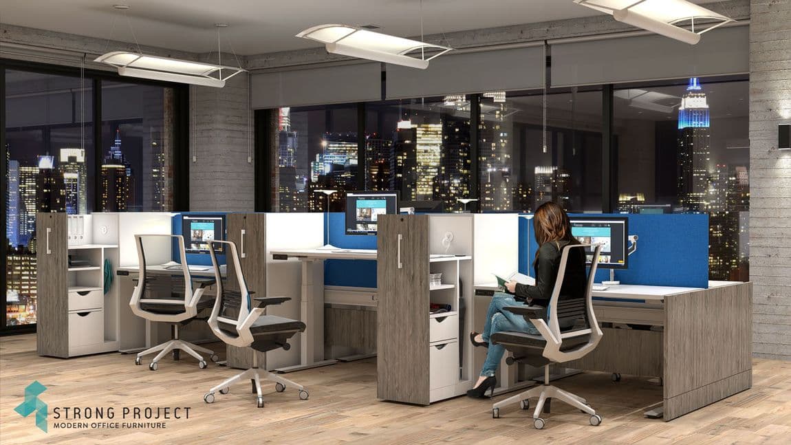 This modern height adjustable workstation system is customizable with laminate side panels with acrylic up-mounts as well as frontal acoustic felt dividers and acrylic up-mounts. All heights of the laminate dividers and acrylic up-mount screens are customizable. The most common divider heights to achieve a feeling of openness while giving users a sense of space and privacy are 49'H overall (laminate side panel + acrylic up-mount) coupled with 12' frontal acoustic dividers with an 8' acrylic up-mount. The most common desktop sizes are 30'D x 60'W, 30'D x 72'W and 30'D x 84'W, but these are customizable as well. The typical storage components coupled with this system are either a Mobile Filing Pedestal or a Low Storage Credenza containing oversized storage and filing drawers coupled with pop-up tech modules for USB and Electrical access to quick charge phones and tablets. Seat cushions can be applied to the low credenzas for impromptu quick meetings with an associate. This contemporary workstation system features a technology spine that accommodates ample data drops and includes an integrated 4-circuit/8-wire electrical system. From a design perspective, there are numerous laminate and thermofoil worksurface and side panel finish options in modern woodgrains as well as white and other solids. The frontal acoustic felt dividers come in 15 different colors to work with your building interior and brand as well as COMs. The frontal up-mounts and side dividers have numerous acrylic color options as well as customization capability with resins such as 3form, Lumicor, etc. This stylish modular office furniture system will give you the flexibility to create a work environment that provides users with their own sense of space, fosters creativity and well-being and can be customized from a design perspective to meld with your building interior and brand.