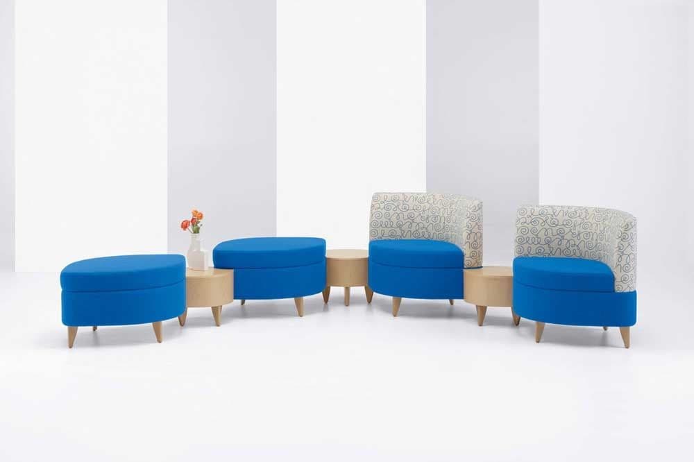 Lounge chair features leaf-inspired shape to enable seated comfort in any position. Accommodates up to 750 lbs. to satisfy bariatric requirements and is available with 360-degree rotating tablet for multi-functional purposes. Full and mid-size benches offered in a variety of sizes and can be specified individually or together with lounge chairs and connecting tables. Connecting tables available in five sizes to create straight or curvilinear arrangements. Offered in Maple, Walnut or White Oak veneer as well as laminate and Corian® selections. All standard and custom finishes available. Tables join together with all lounge and bench models as well as their child-size counterparts. All models feature four wood or metal legs as standard. Metal legs available in Polished Aluminum as well as Metallic Silver and Graphite powdercoat finishes. For more permanent connections, a ganging leg option is offered. Coordinating children’s collection available.