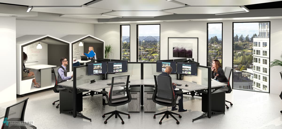 A new variable entering the office design world is the Hybrid Office Model. When furnished correctly, a hybrid workplace can break down the walls between employees and encourages a much deeper level of connection and collaboration. A trend resurfacing today in response to an increasingly hybrid workforce, “Hot Desking” is a free-range approach to office design in which employees are encouraged to share more community space and even shuffle between larger tables, collaboration areas, and open office workstations. Featured here are our space-efficient organic-shaped Open Office Workstations (ideal for Hot Desking) paired with some of our Acoustic Meeting Pod designs. Let us help you furnish an atmosphere that drives productivity, fuels innovation, inspires creativity, and encourages community.