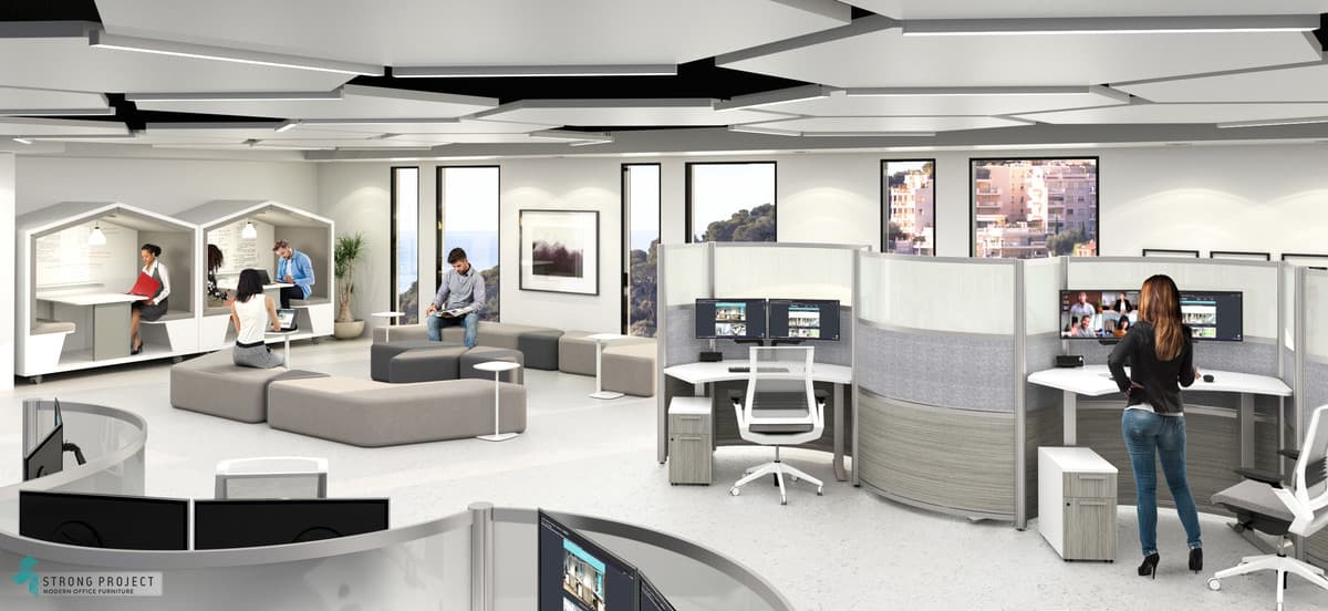 The Hybrid Office must become a resource where employees want to go. Here they can find things that they can’t get at home. Featured here are our innovative Curved Height-Adjustable Privacy Workstations paired with some of our Collaborative Furniture and Acoustic Meeting Pod designs. Let us help you Create an atmosphere that drives productivity, fuels innovation, inspires creativity, and encourages community.