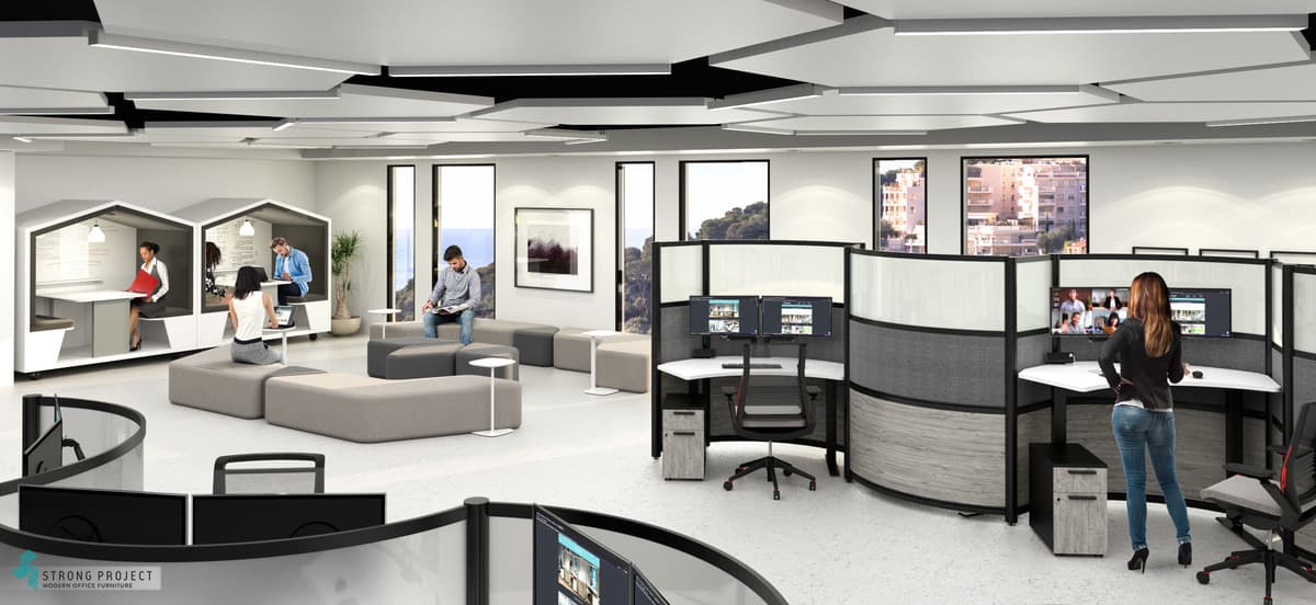 The Hybrid Office must become a resource where employees want to go. Here they can find things that they can’t get at home. Featured here are our innovative Curved Height-Adjustable Privacy Workstations paired with some of our Collaborative Furniture and Acoustic Meeting Pod designs. Let us help you Create an atmosphere that drives productivity, fuels innovation, inspires creativity, and encourages community.