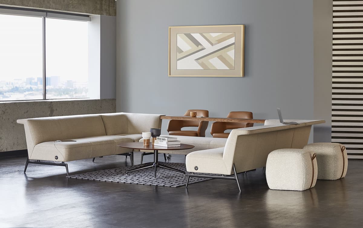 Modular configurations comprised of lounge, love seat and sofa models in addition to corner units and benches.