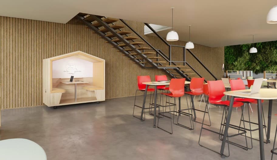 Mobile Privacy Pod for 1-2 people that is Open on one side - This design is less "claustrophobic" than the enclosed pods with doors and balances the openness and approachability with a surprising quietness once inside. Includes table, seating, 3 power + 3 USB charging outlets, and ceiling lamp. Mobility - Comes with heavy-duty locking casters so that 1-2 people can easily move the unit. This portability enables hyper-agile environments. External Dimensions: 79"W x 36'D x 77"H. 570lbs