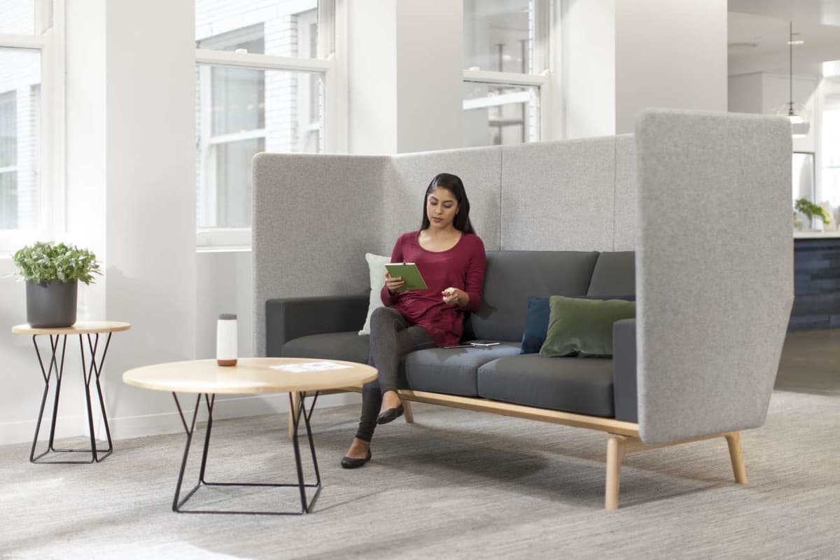 Each detail of the design works together to create a pocket of people to gather or spend time alone, from its rounded corners to the precise thickness of the sound-dampening felt.