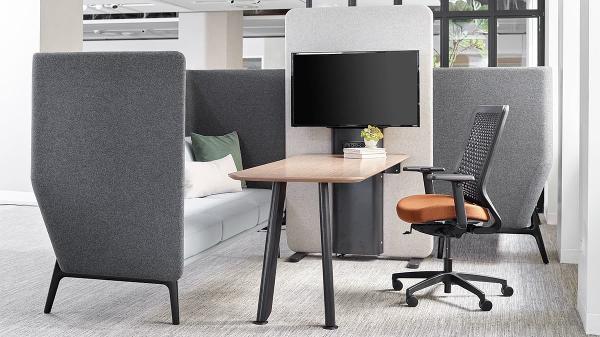This acoustic furniture series for Hybrid Working Environments comes in different configurations with options for tables, lights, and screen mounts, metal or wooden legs and numerous available fabrics.