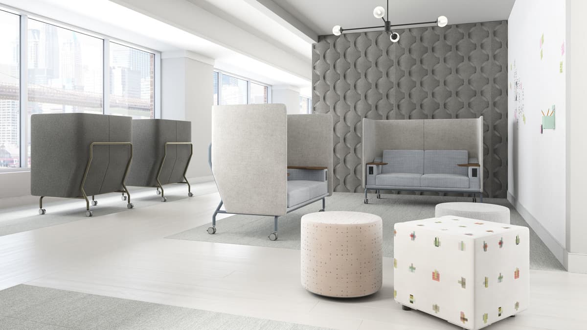 For individuals, this acoustic seating design creates a place for people to escape, think, and breathe. For groups, it creates a place for people to closely collaborate and connect. We even took it to a more portable level with the new mobile version, creating the option to adjust the space according to employee needs throughout the day. This design’s comfort and visual softness allow these small rooms to blend seamlessly into the office, while still providing the closeness and privacy people need to really focus.