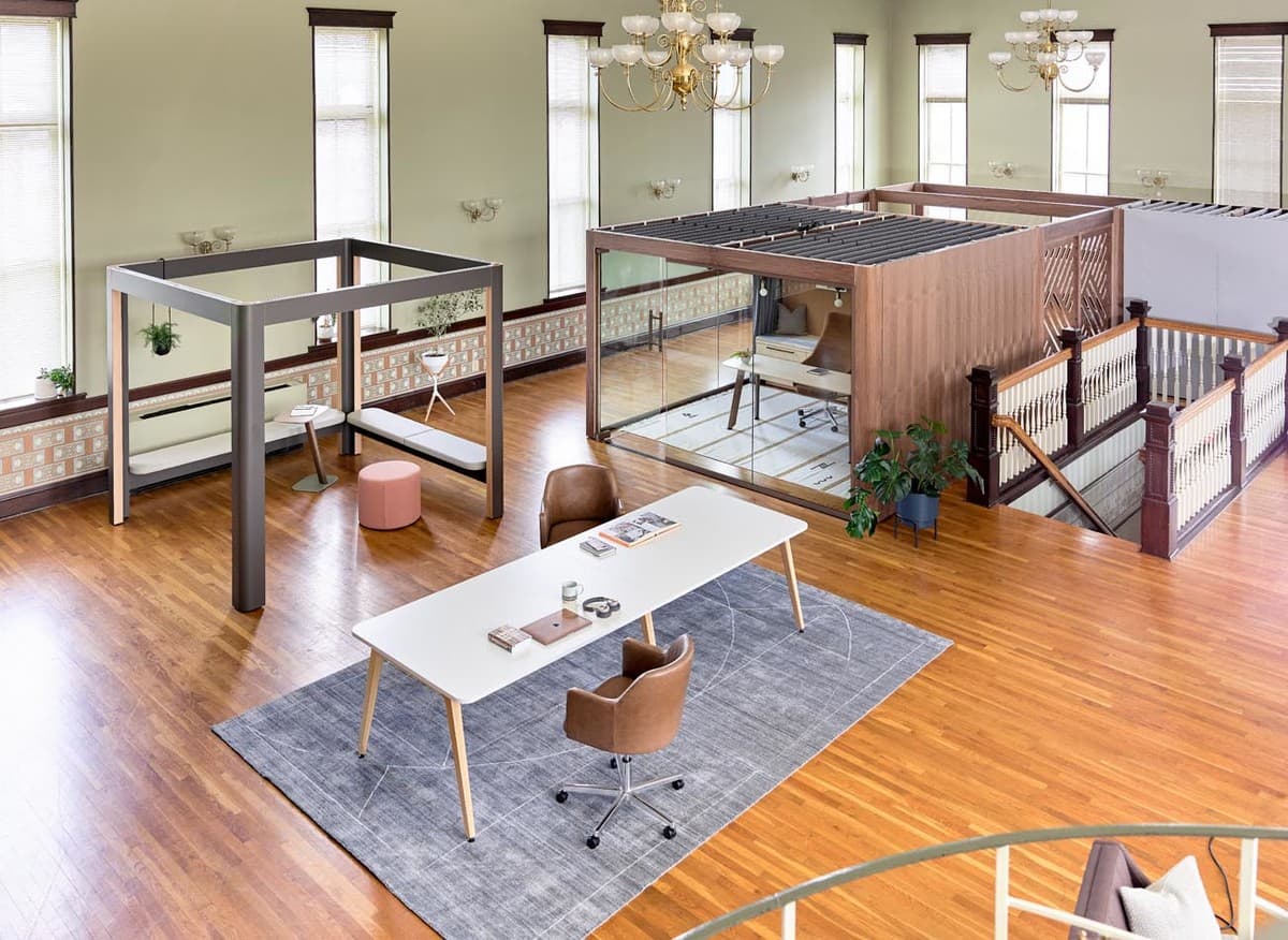 Soft Architecture frees us from being locked into permanent situations and fosters our ability to adapt to whatever lies around the corner. Creating anchor products that serve as both architectural elements that can be changed as needs shift, as well as activating the spaces within that framework, will give power and flexibility to both employees and their teams. All the furniture in this scene is available for purchase, even if you don’t wish to purchase the wood frame structures. Click on the “Details” tab for some thought starters.