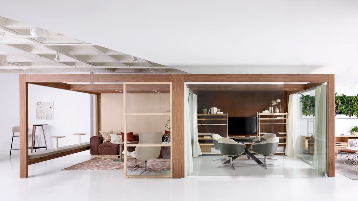 Soft Architecture frees us from being locked into permanent situations and fosters our ability to adapt to whatever lies around the corner. Creating anchor products that serve as both architectural elements that can be changed as needs shift, as well as activating the spaces within that framework, will give power and flexibility to both employees and their teams. All the furniture in this scene is available for purchase, even if you don’t wish to purchase the wood frame structures. Click on the “Details” tab for some thought starters.