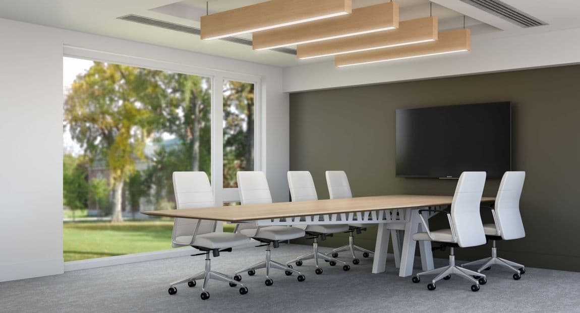 Additionally, the optional exposed truss aesthetic creates a structural statement, complementing current architectural forms. Unimpeded knee space is enjoyed at every position around the table. Designed for technology integration, it includes base and trough covers to conceal power and cabling without compromise.
