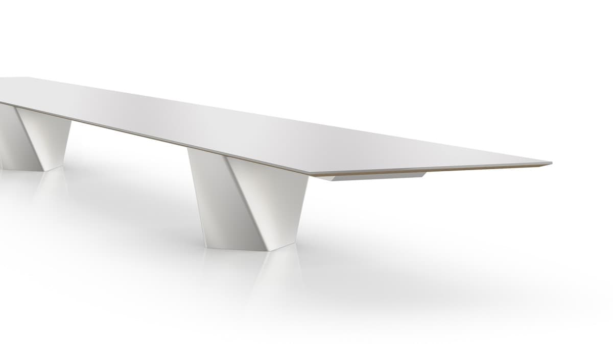 Inspired by ancient architecture, this boardroom table tells a story of design built to last. Constructed of fiberglass and reinforced steel, this ultra-modern boardroom table design supports spans up to 36 feet with two bases. Available in a variety of high-gloss and matte paint finishes, this conference table is designed to make a statement in the spaces that matter most.