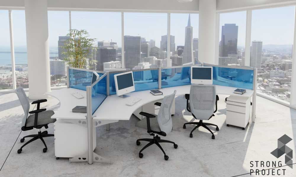 The efficient angles of this open, collaborative cubicle design allows businesses to optimize on their available square footage by allowing for a higher number of seats than most linear designs while still providing a sense of openness. When placed in an open plan, the geometry of the pods provides a more organic flow than rows and rows of liner cubicles. Available with or without rounded collaboration ends.