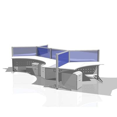 The efficient angles of this open, collaborative cubicle design allows businesses to optimize on their available square footage by allowing for a higher number of seats than most linear designs while still providing a sense of openness. When placed in an open plan, the geometry of the pods provides a more organic flow than rows and rows of liner cubicles. Available with or without rounded collaboration ends.