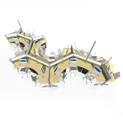 The efficient angles of this open, collaborative cubicle design allows businesses to optimize on their available square footage by allowing for a higher number of seats than most linear designs while still providing a sense of openness. When placed in an open plan, the geometry of the pods provides a more organic flow than rows and rows of liner cubicles. Available with or without rounded collaboration ends.