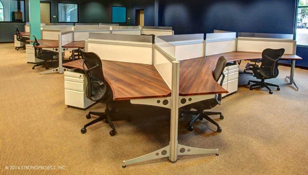 The efficient angles of this open, collaborative cubicle design allows businesses to optimize on their available square footage by allowing for a higher number of seats than most linear designs while still providing a sense of openness. When placed in an open plan, the geometry of the pods provides a more organic flow than rows and rows of liner cubicles. Available with or without rounded collaboration ends.